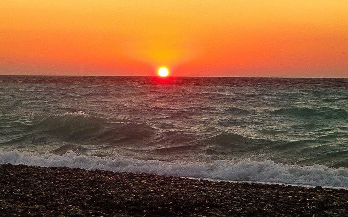 Egal, wo im Westen von Rhodos man sich befindet: Die Sonne zeigt sich hier frühabends als gleißender Ball, der anmutig im Meer versinkt. Wer in Rhodos-Stadt untergebracht ist, braucht nur ans westliche Meerufer zu laufen – auch hier lässt sich der Sonnenuntergang herrlich erleben. Unser Lieblingsplatz: Die nördlichste Spitze der Insel – hier ist ein breiter Kiesstrand, Ägäis und Mittelmeer treffen aufeinander. Man kann kurz vor Sonnenuntergang noch im Meer baden und vom Wasser aus die langsam sinkende Sonne beobachten.